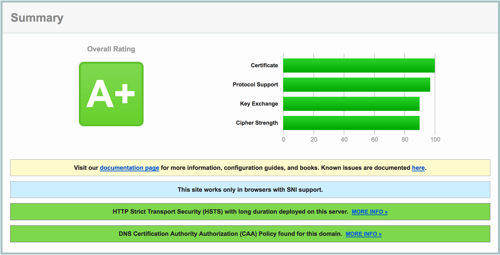 After we wait a while for the recent DNS change to take effect, we can recheck with the SSL Labs Tester. The result is this: