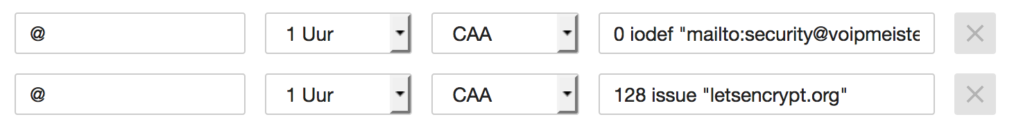 In my case, for voipmeister.com, I am using Let’s Encrypt as the CA for my certificates. So, if I want to implement a CAA policy, all I need to do is add DNS records like this: