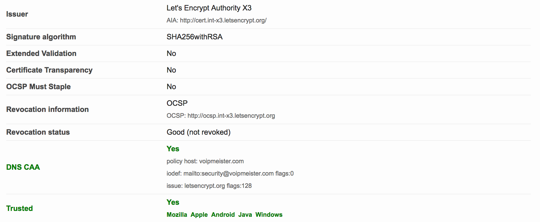 Do notice the extra green bar pertaining to CAA, and see the DNS CAA information in the details: